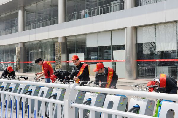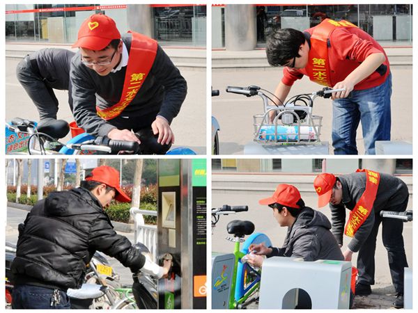 三月风光独好,阳光和煦暖人心,学雷锋行动正当时。15日下午,院青年志愿者服务队一行8人,头戴志愿者小红帽,身披“奉献、友爱、互助、进步”志愿者绶带,来到驻区附近的几处公共自行车租赁点,开展义务清洁打扫活动。将一排排自行车擦洗完毕后,团员青年们又将停车柱和站点管理箱的边边角角也仔细清洁干净。阳光洒在脸上,映照出一排灿烂的笑容,路过的行人纷纷点头称赞,有些还主动要求加入到我们的队伍中来。