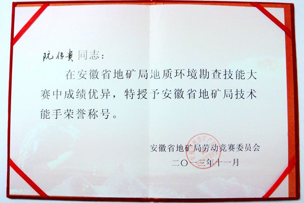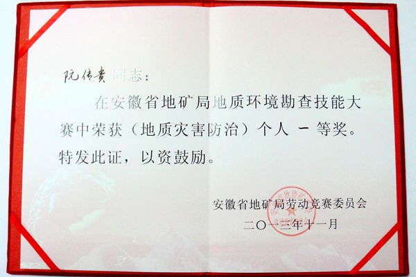 安徽省地质环境勘查技能大赛于10月30日至11月1日在合肥市和金寨县两地举行。由阮传贵、马宏宇、檀集满、孙友霖四位选手组成的我院代表队,经理论考试和野外勘查两轮激烈角逐,喜获技能大赛团体第四名。阮传贵同志获地质灾害防治技能一等奖,并被授予安徽省地矿局“技术能手”荣誉称号。